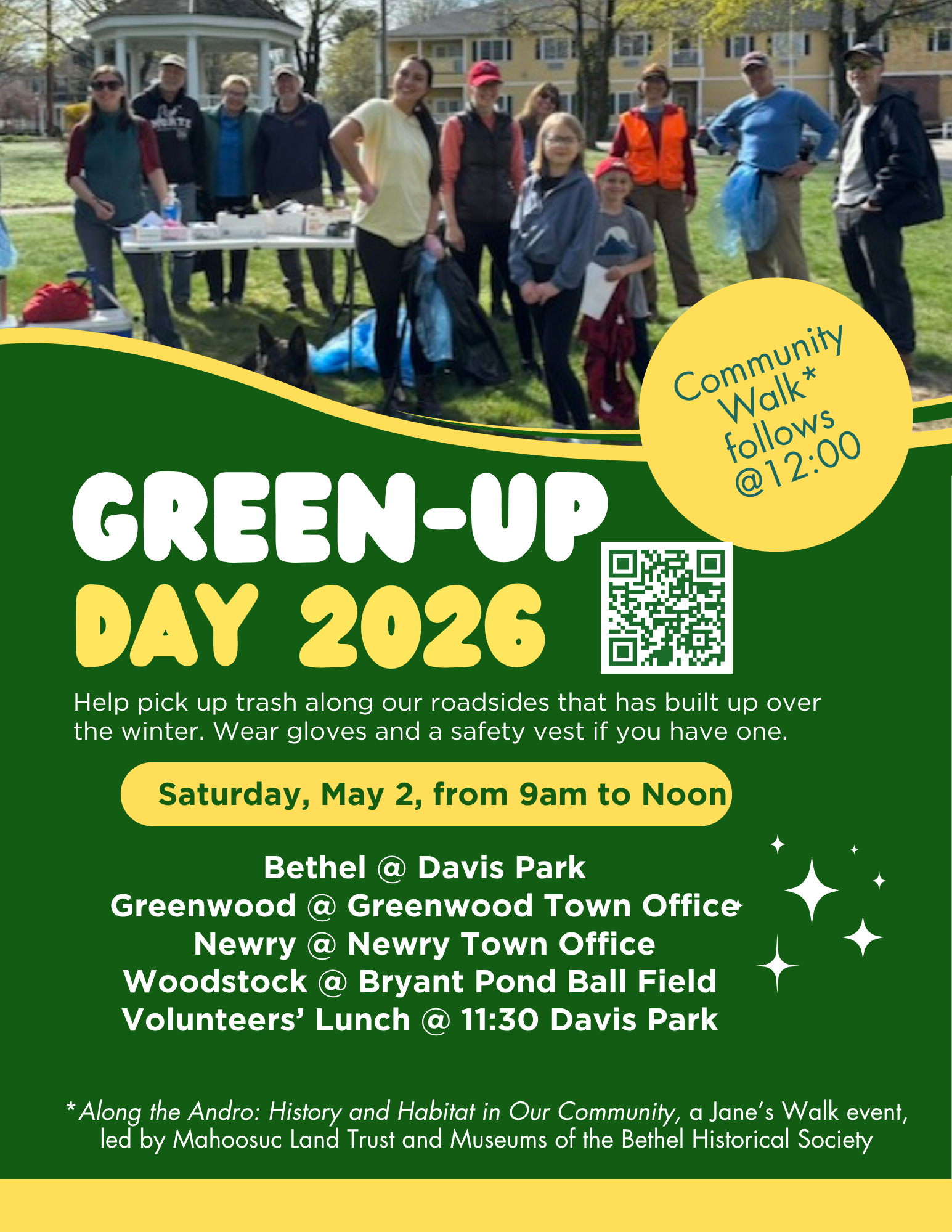 We will meet at Davis Park @ 9:00am to pick sections of roadside to clean up. We’ll reconvene at 11:30am for a FREE volunteer lunch at the park. Bags and gloves will be provided. We encourage you to wear sturdy shoes and bright colored clothing. Please join us in helping to make Bethel beautiful for the Spring and Summer! After Green-Up Day, join MLT and the Museums of the Bethel Historical Society for a community walking tour as part of Jane’s Walk Maine! Beginning at Davis Park, they will lead a walk on the 2.5-mile accessible Bethel Pathway trail to Valentine Farm, with some stops for historical & ecological learning and conversation along the way! Shuttles will be provided from Valentine Farm back to Davis Park, as needed.
