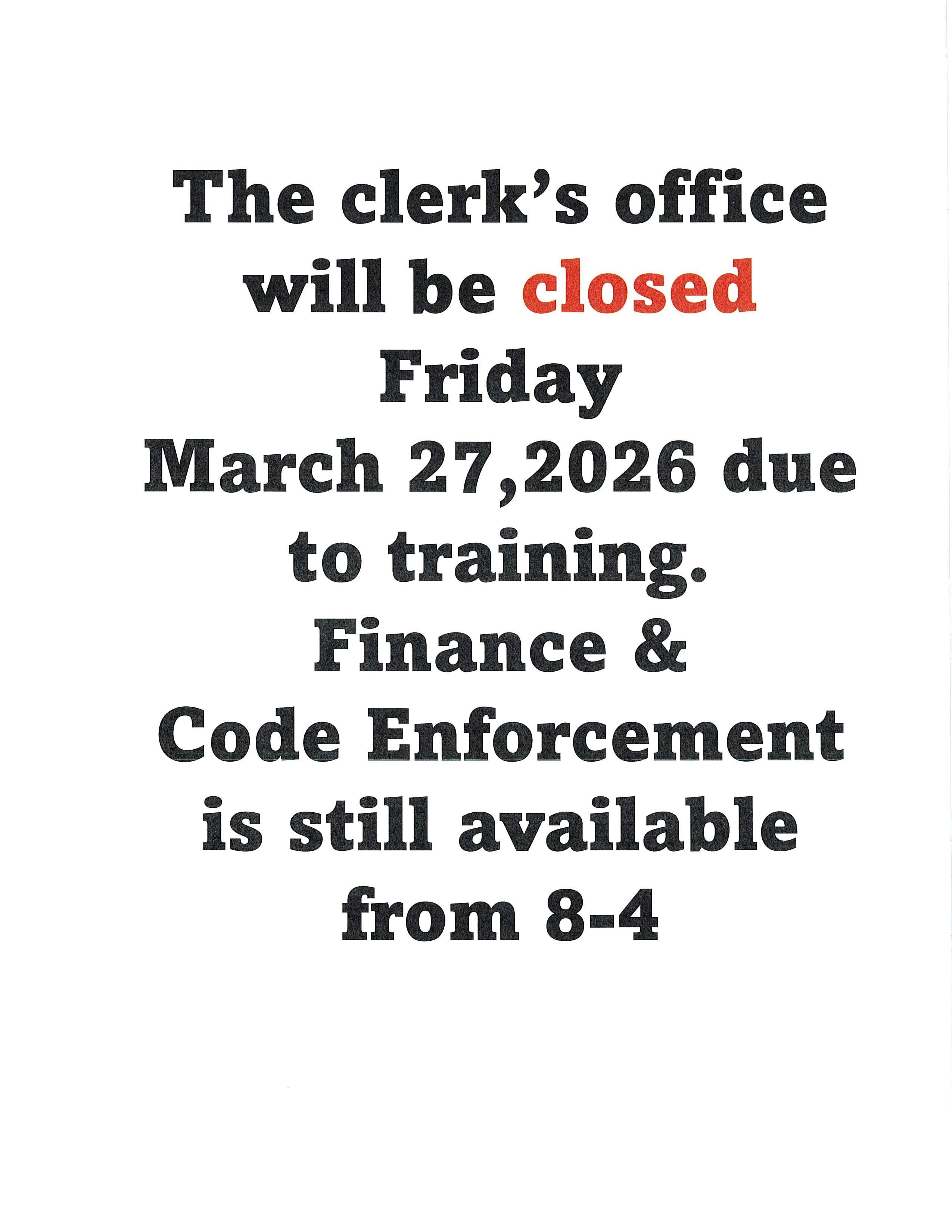 The Clerks Office Closed Friday, March 27, 2026, for training